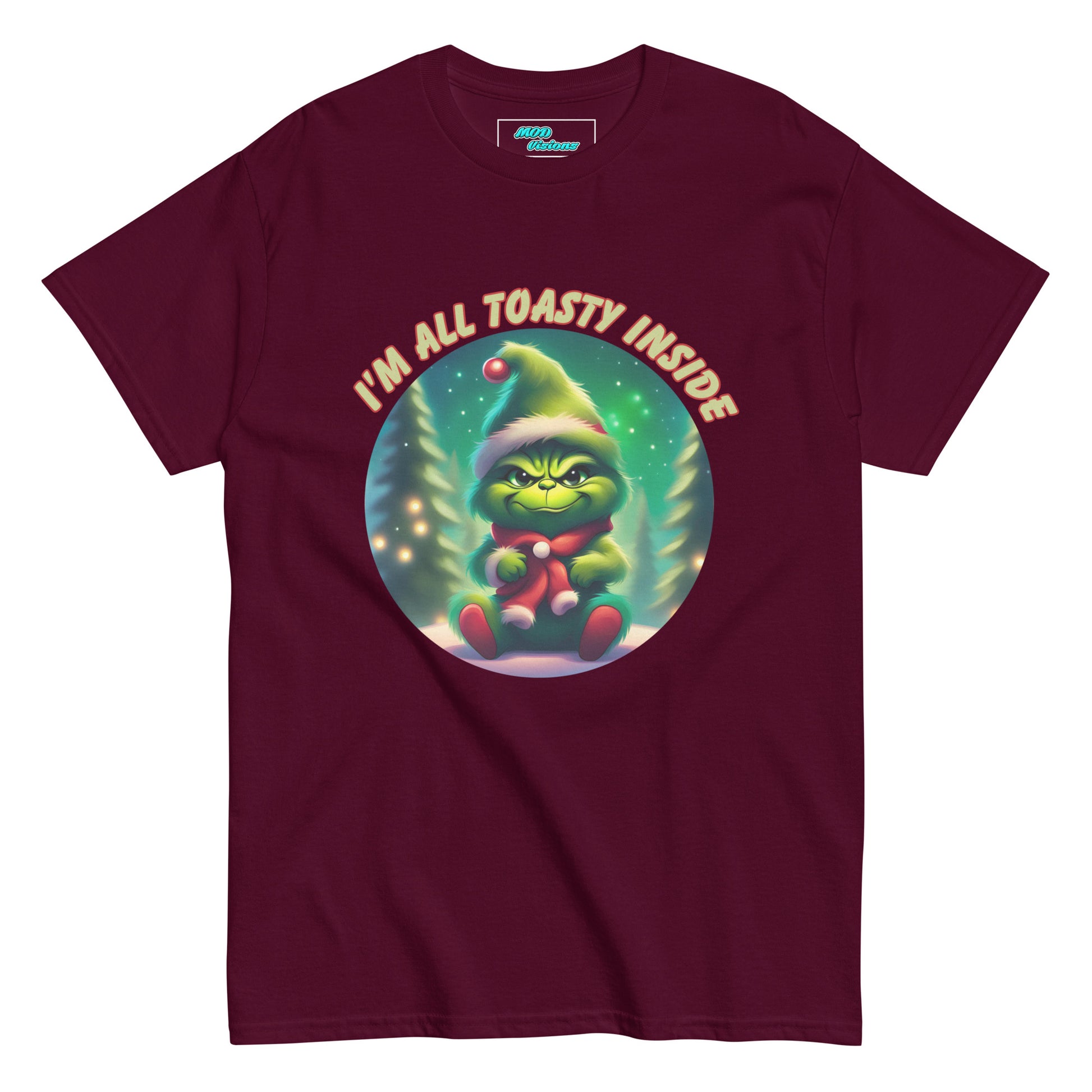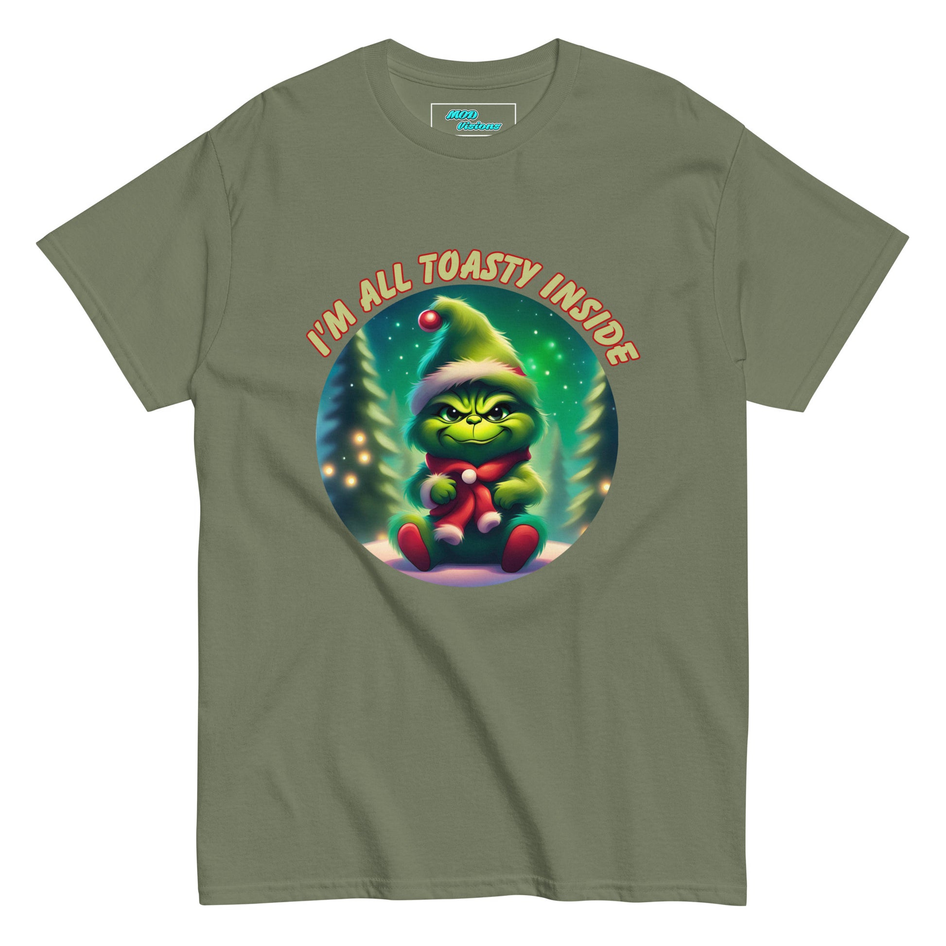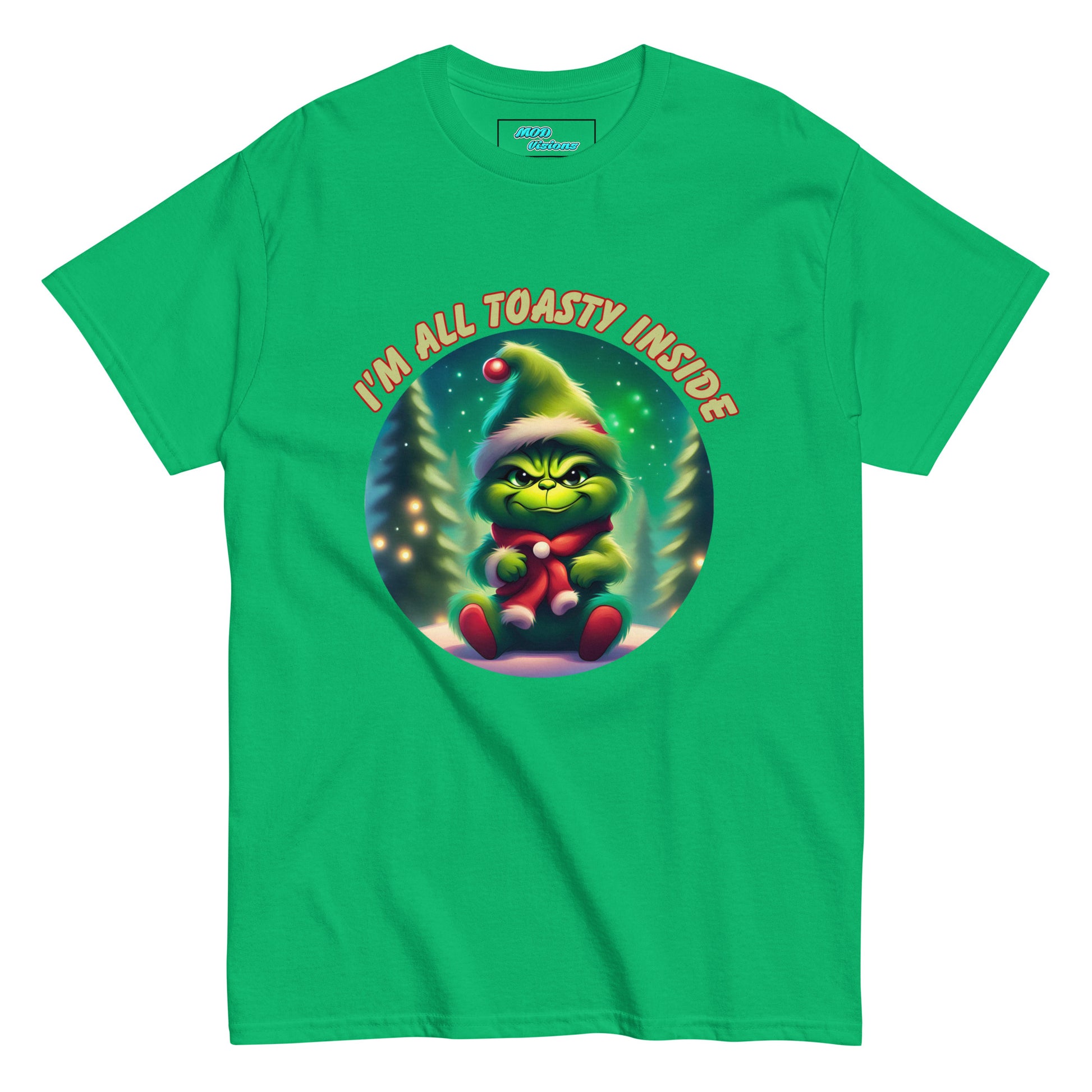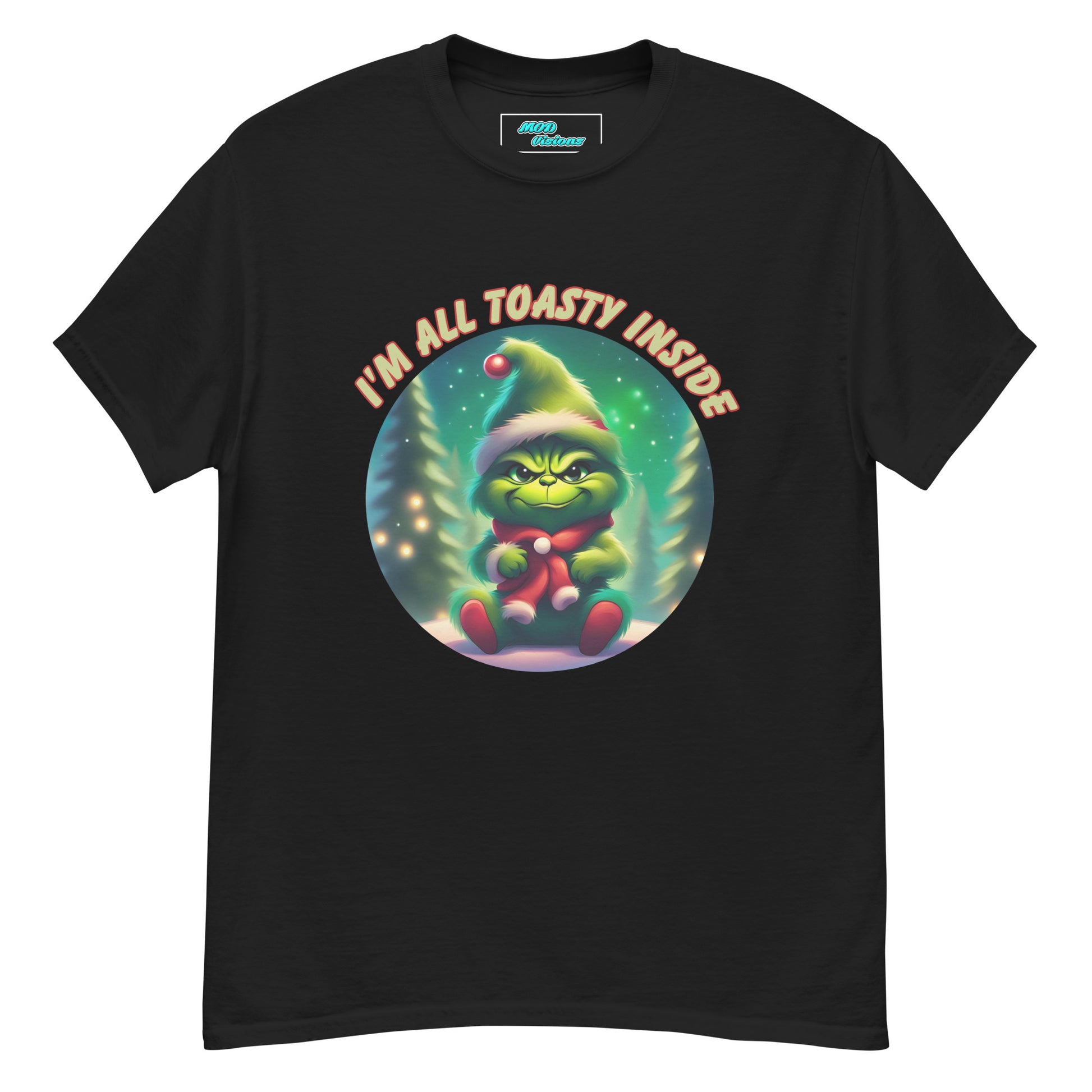 Step into the festive spirit with our Christmas T-shirt featuring the adorable Baby Grinch exclaiming, "I'm all toasty inside." This whimsical and heartwarming design is the perfect way to showcase your holiday cheer with a touch of mischievous charm.