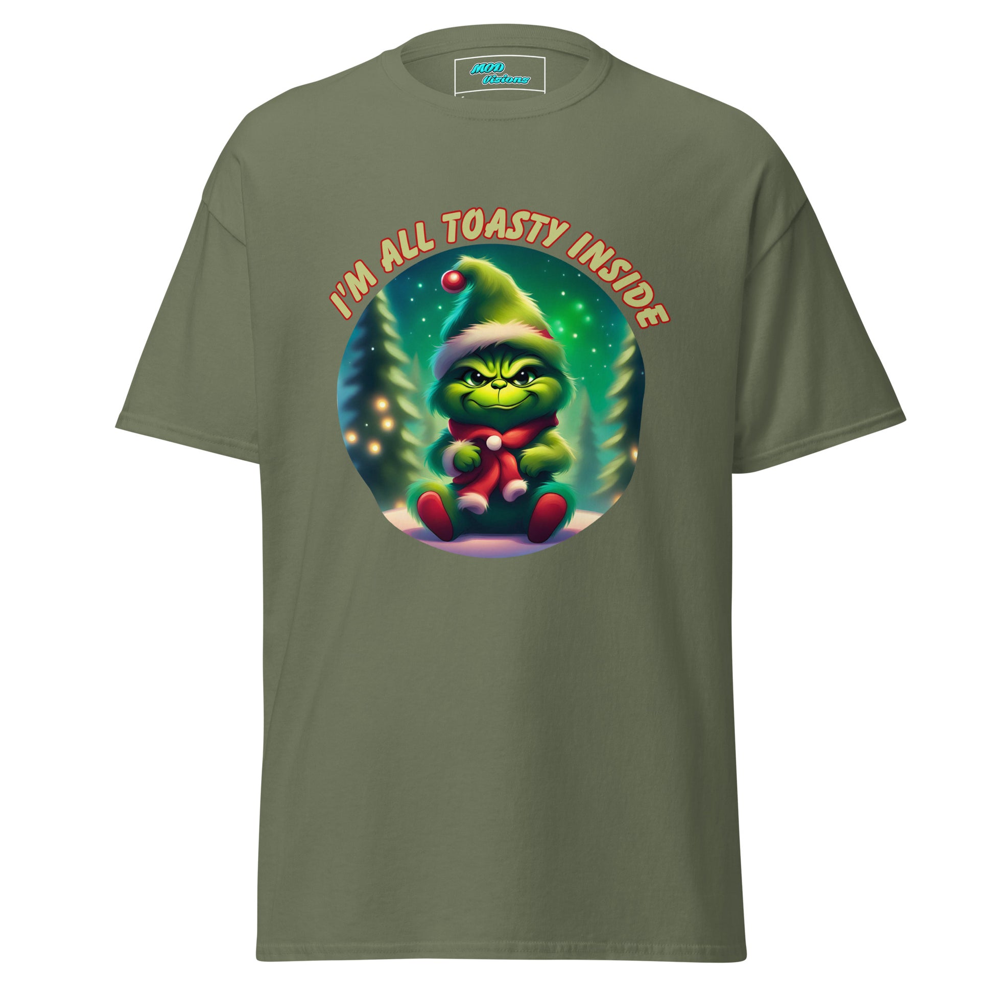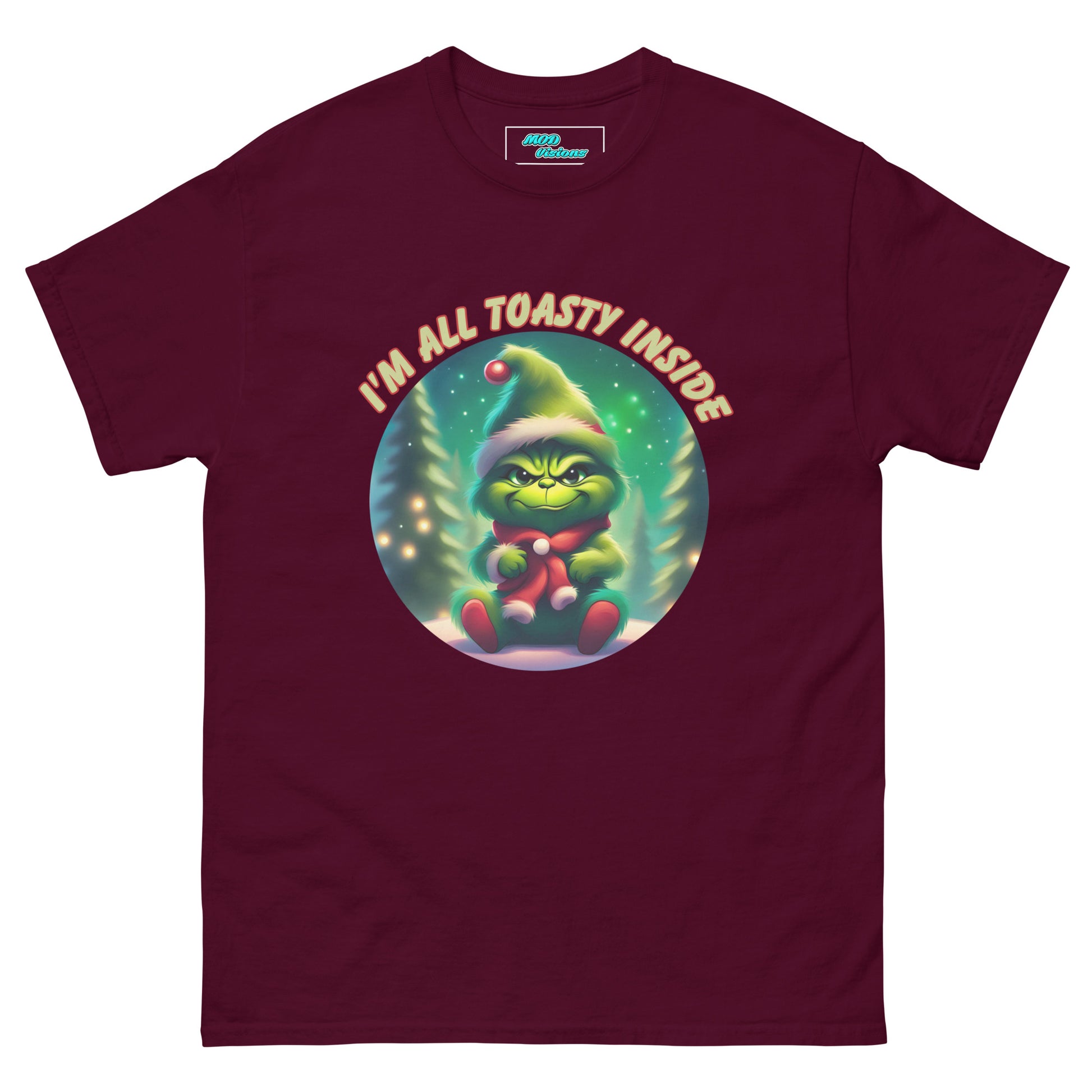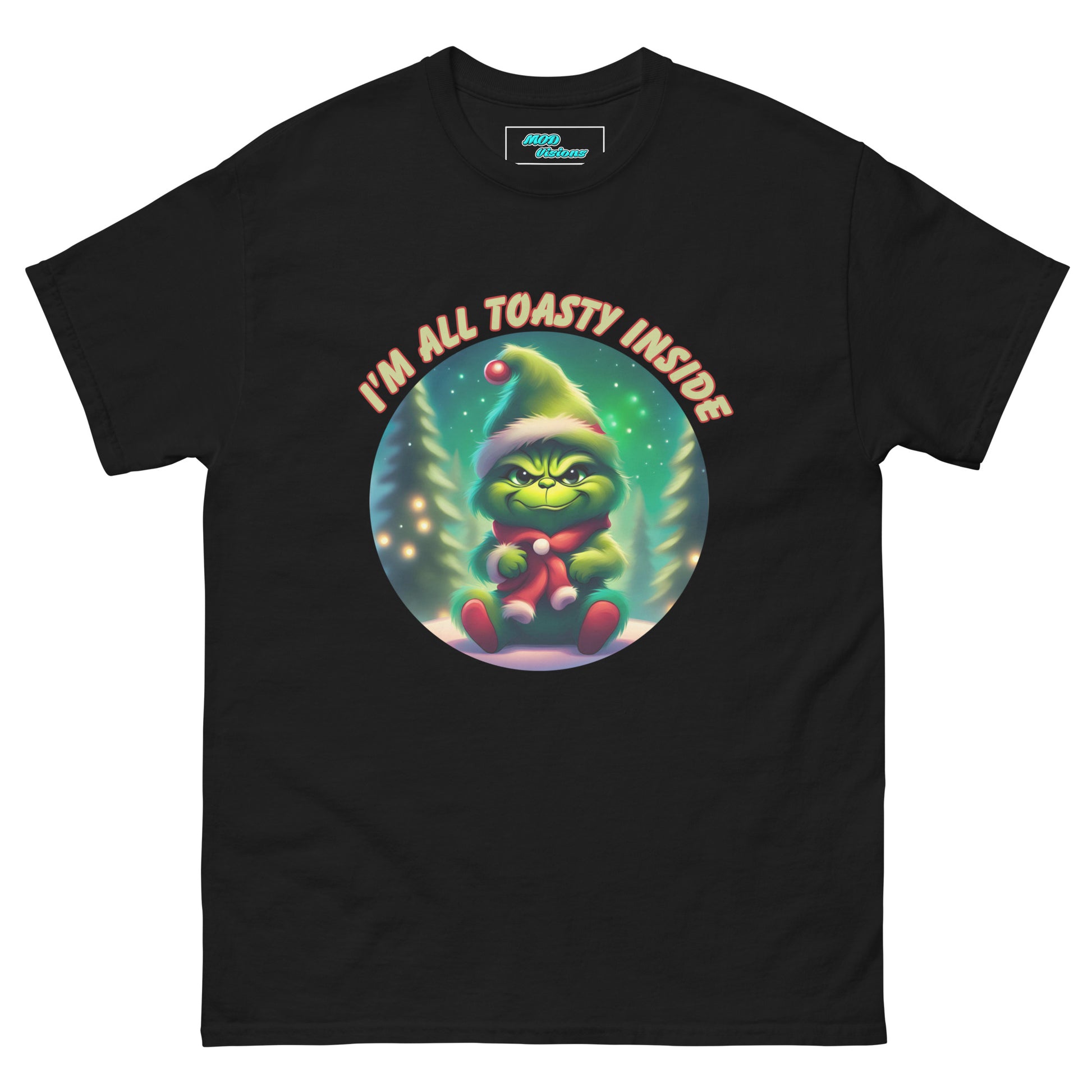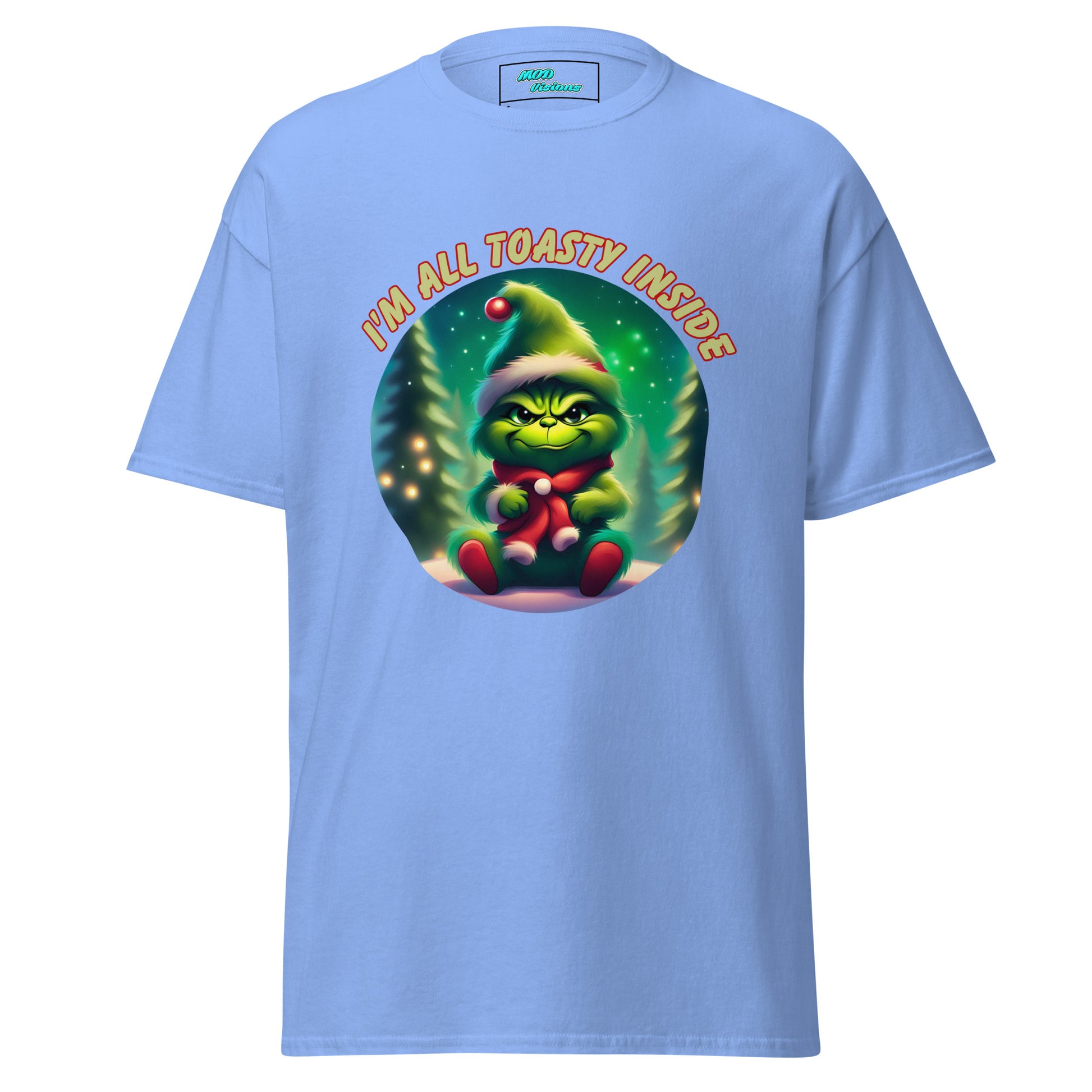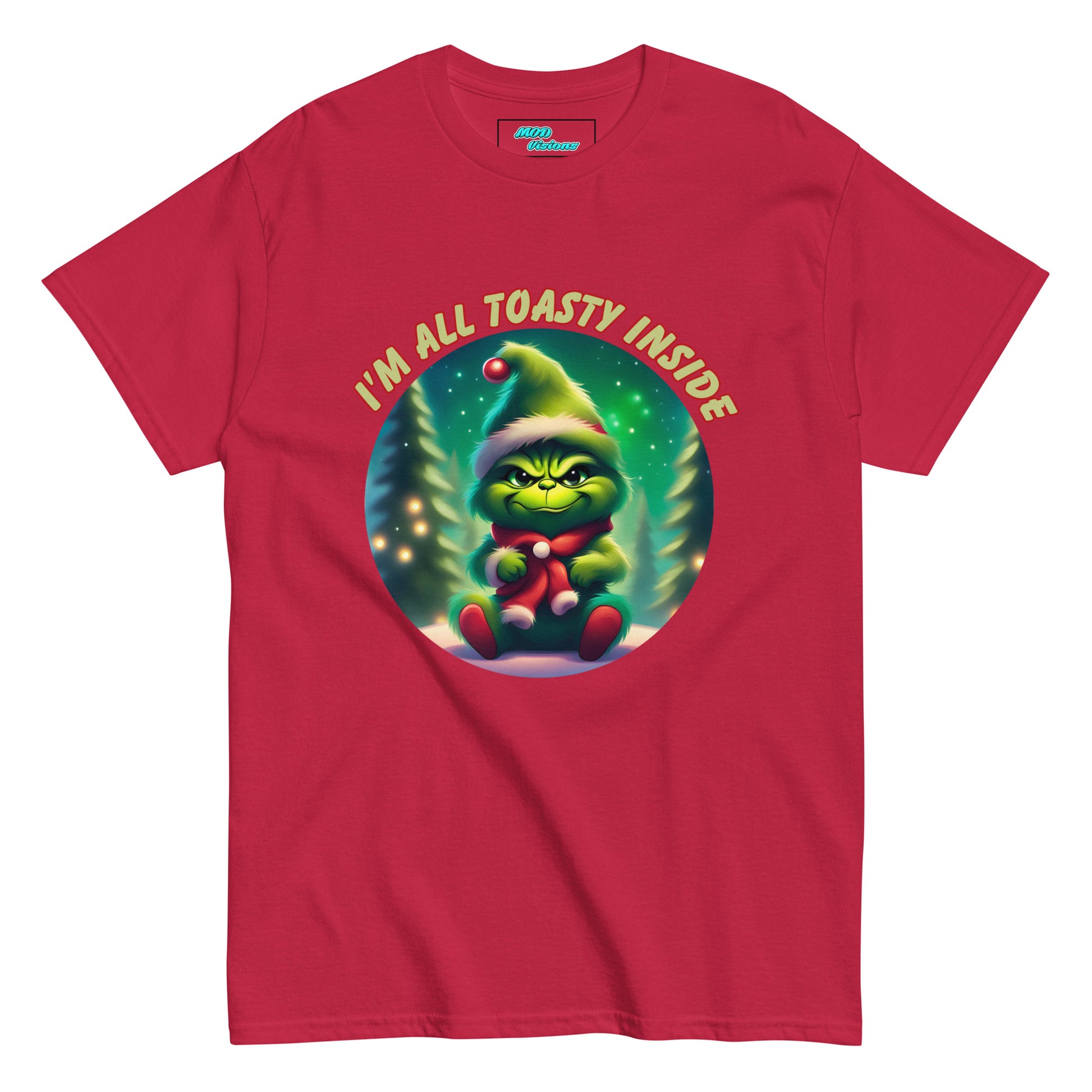 Step into the festive spirit with our Christmas T-shirt featuring the adorable Baby Grinch exclaiming, "I'm all toasty inside." This whimsical and heartwarming design is the perfect way to showcase your holiday cheer with a touch of mischievous charm.