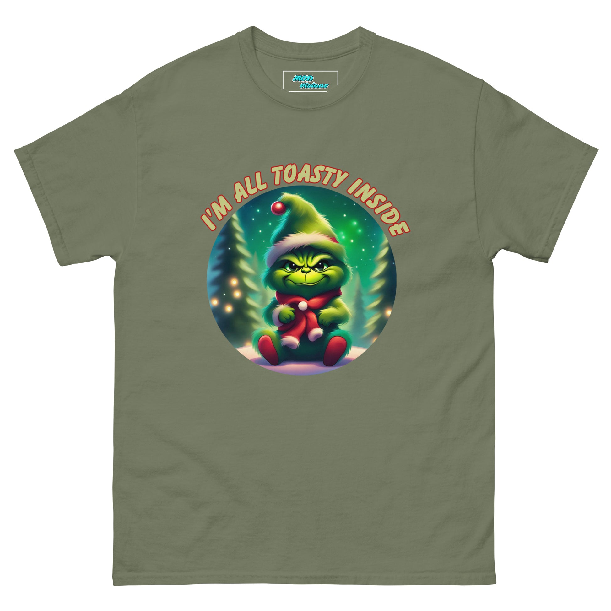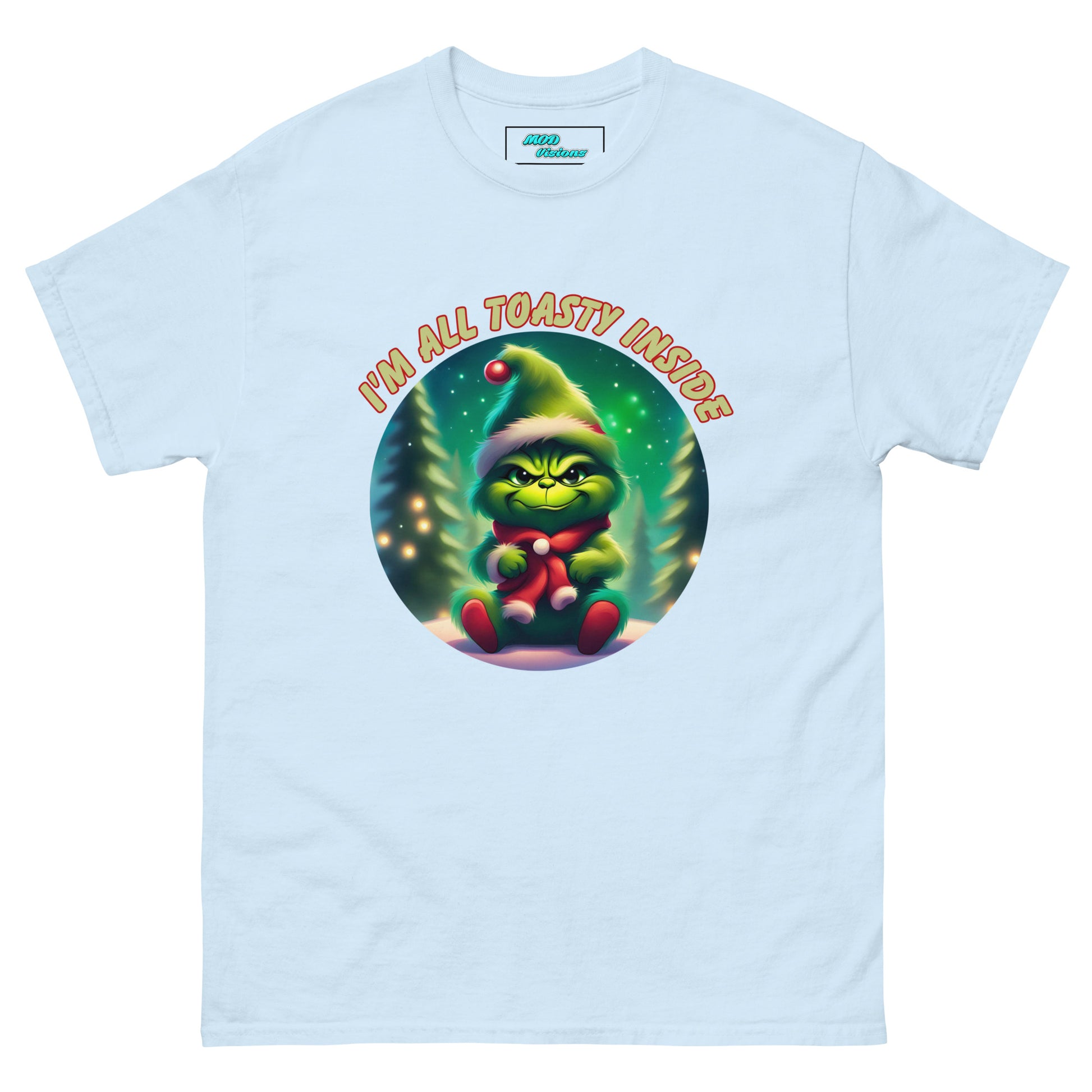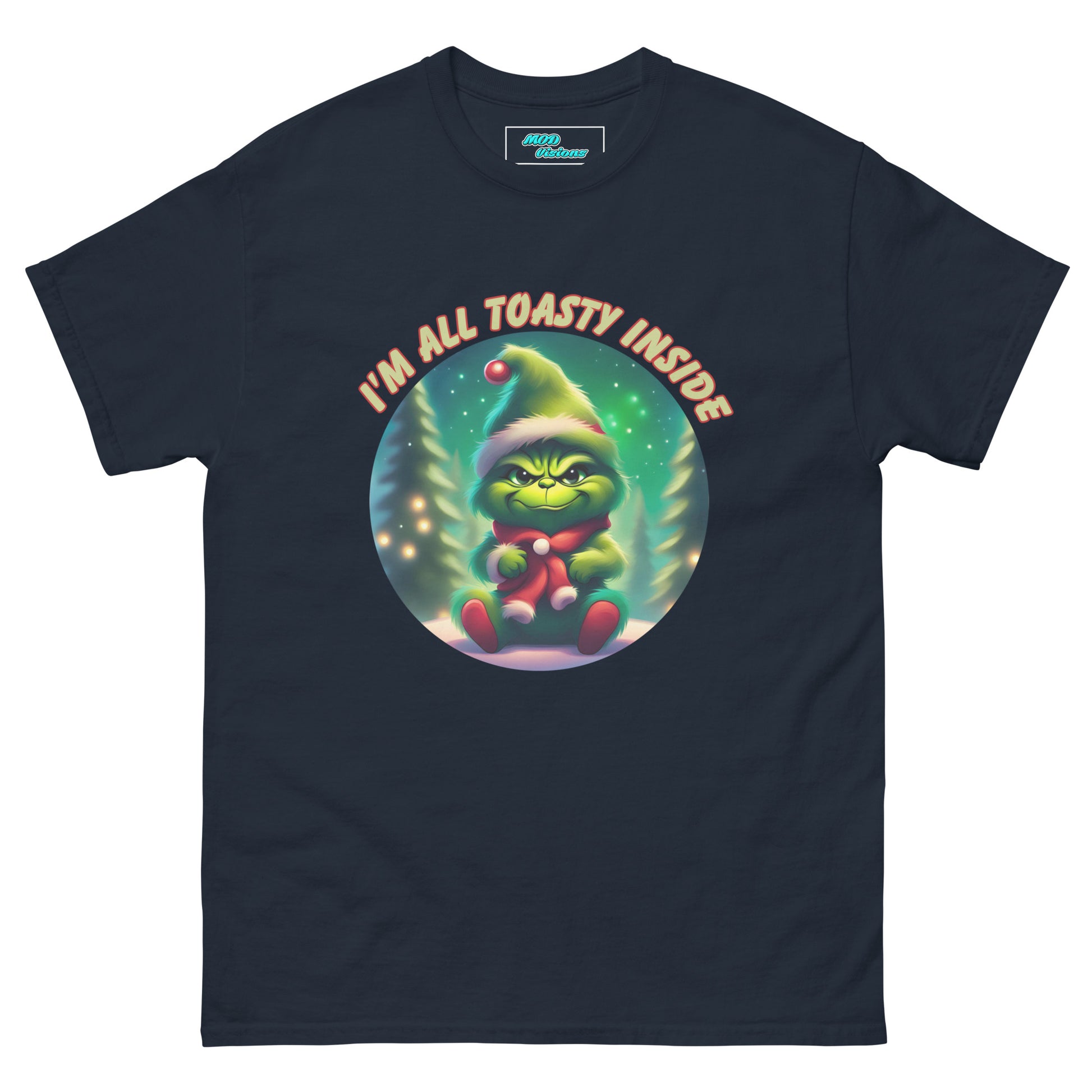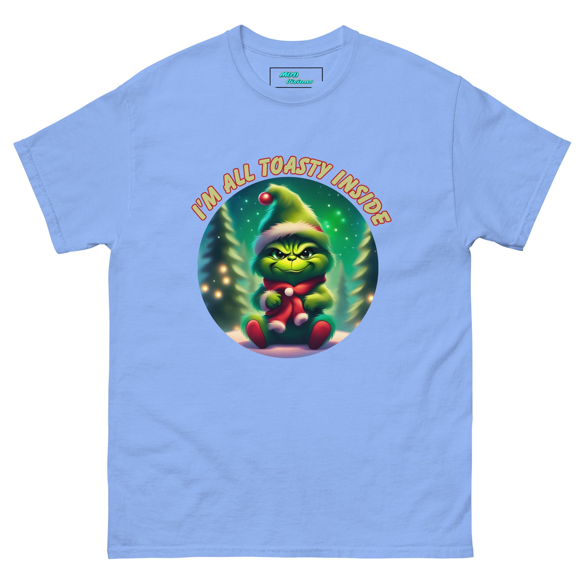 Step into the festive spirit with our Christmas T-shirt featuring the adorable Baby Grinch exclaiming, "I'm all toasty inside." This whimsical and heartwarming design is the perfect way to showcase your holiday cheer with a touch of mischievous charm.