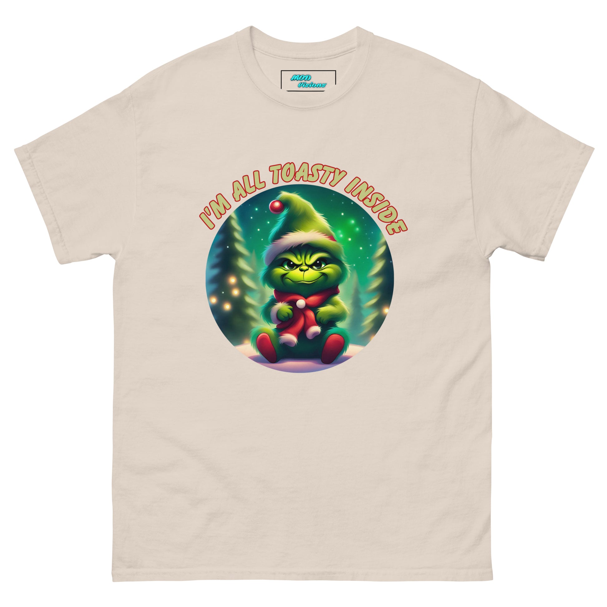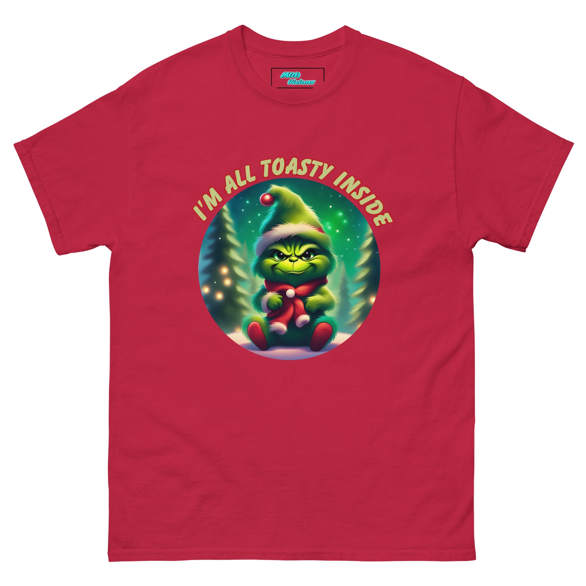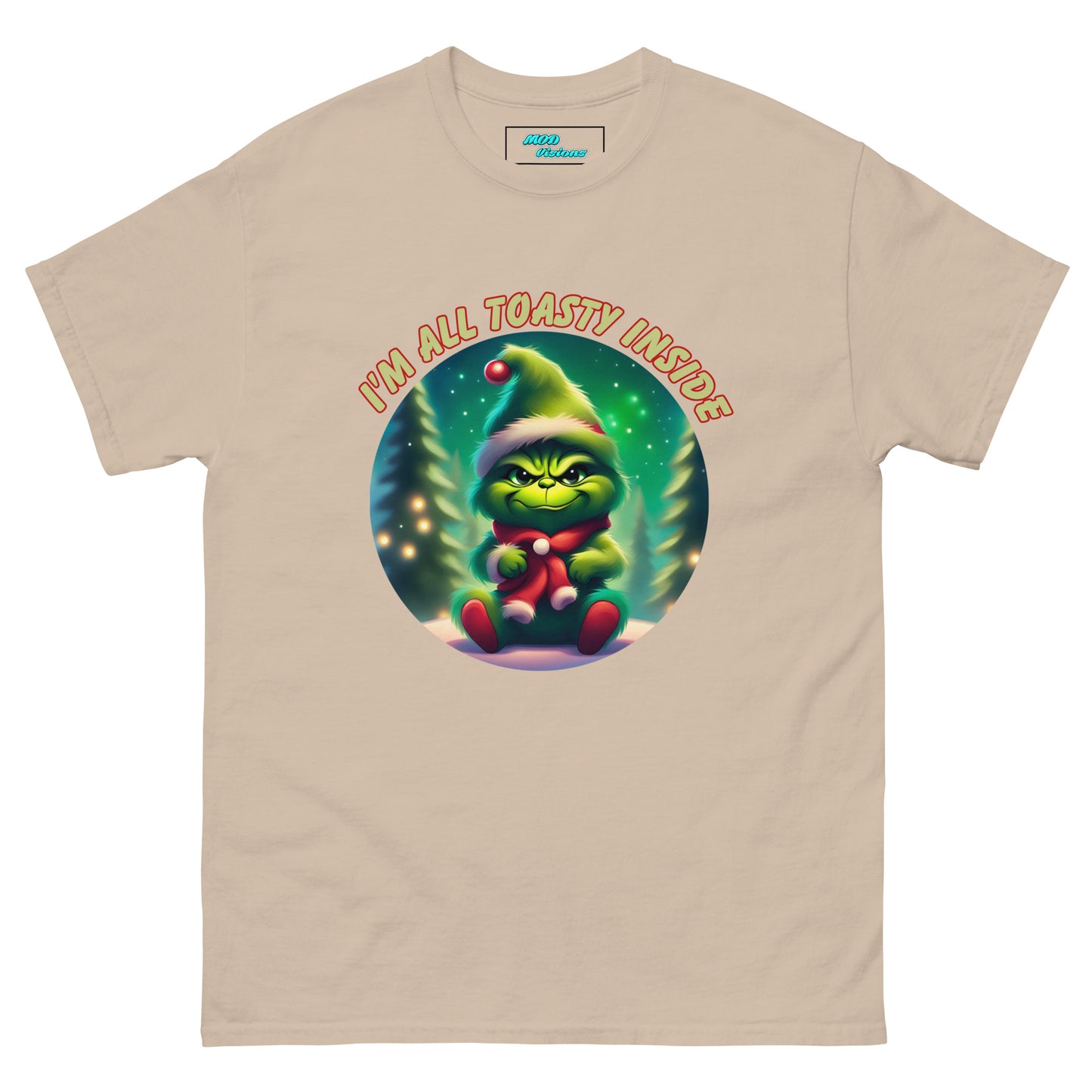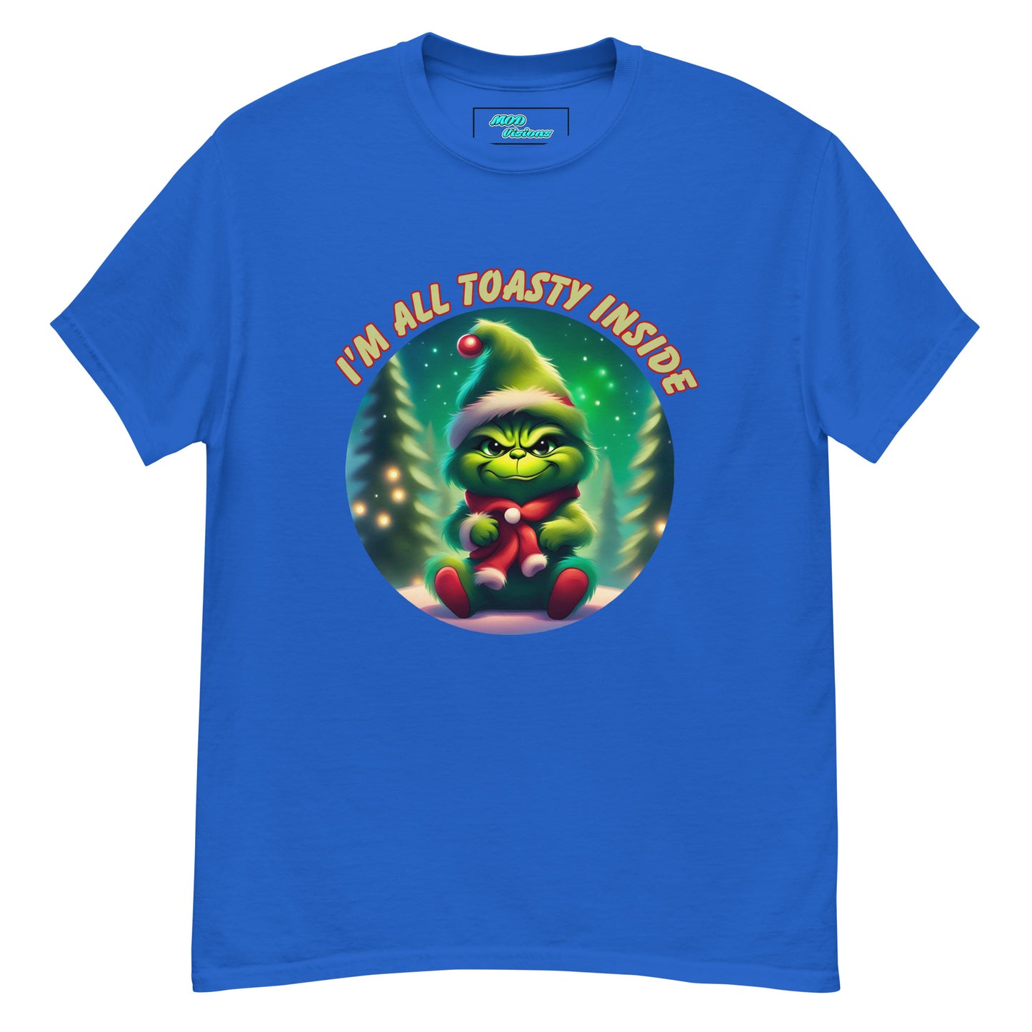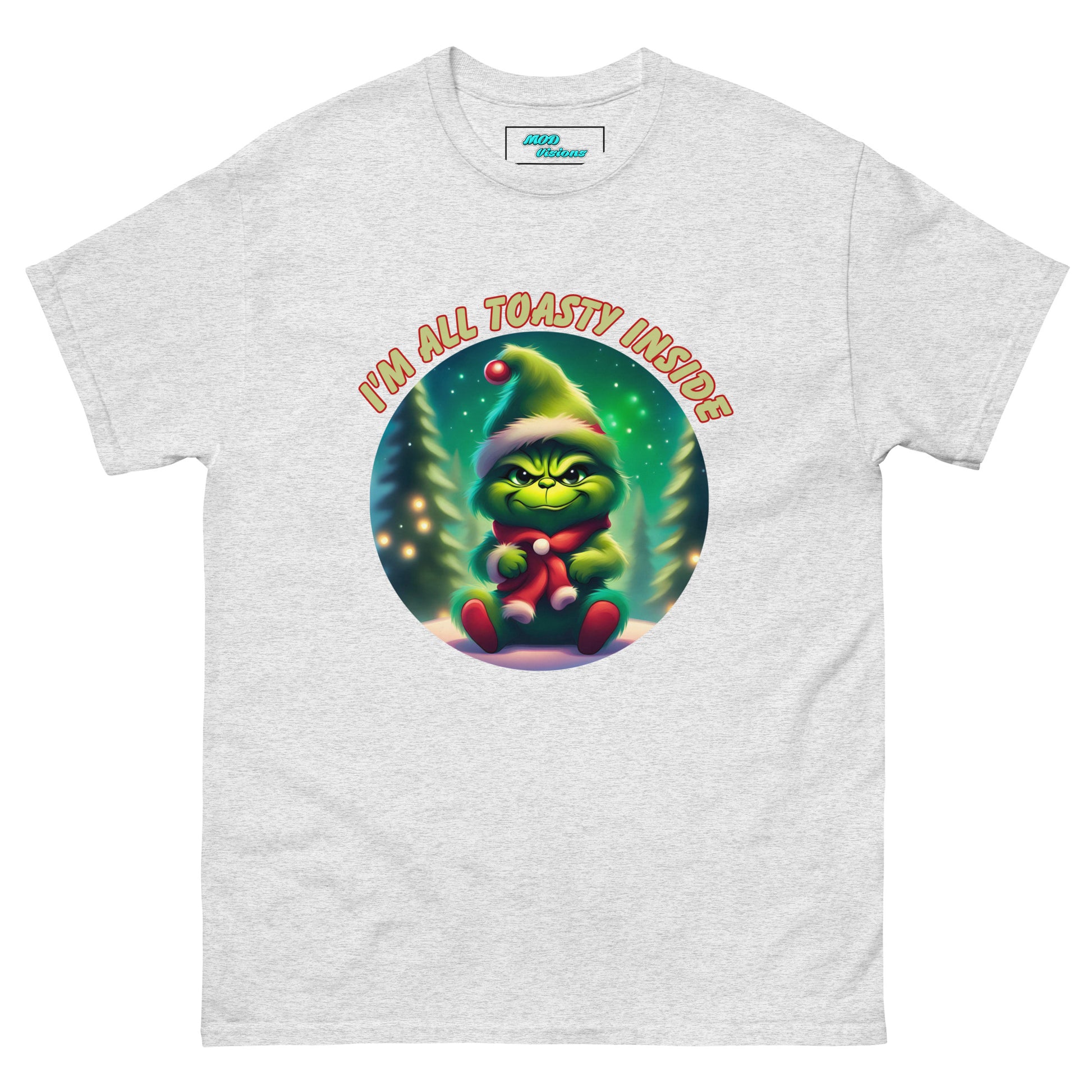 Step into the festive spirit with our Christmas T-shirt featuring the adorable Baby Grinch exclaiming, "I'm all toasty inside." This whimsical and heartwarming design is the perfect way to showcase your holiday cheer with a touch of mischievous charm.