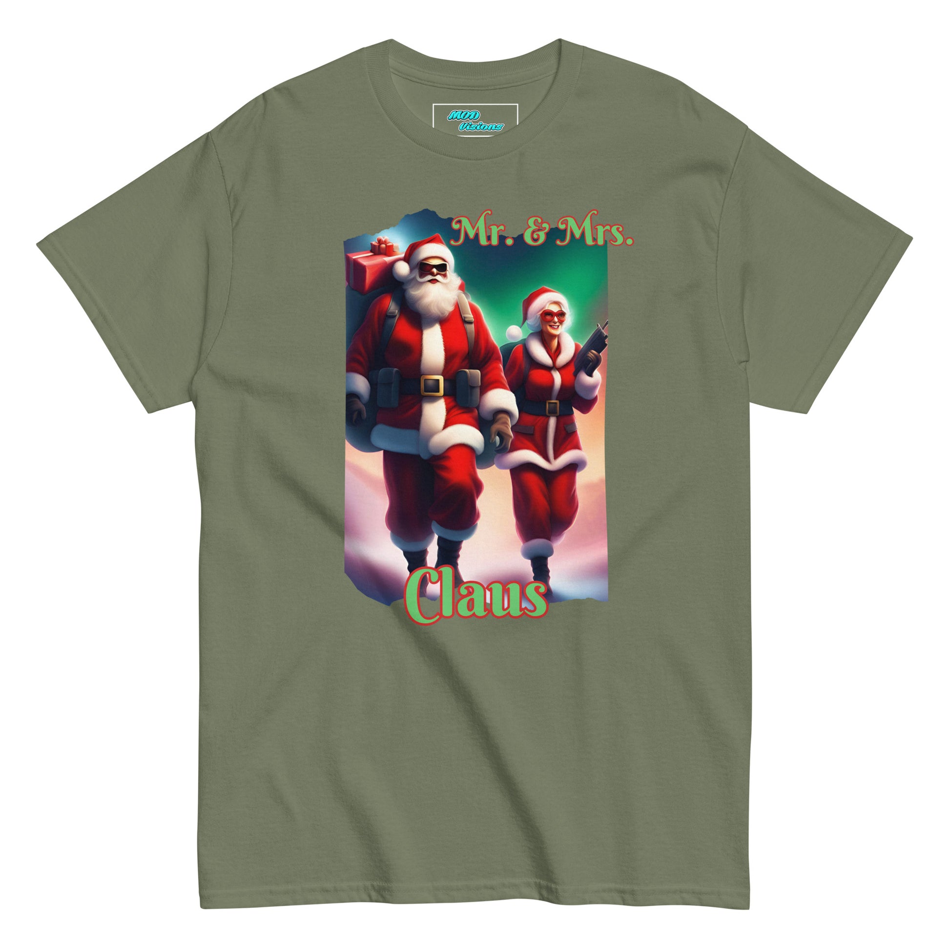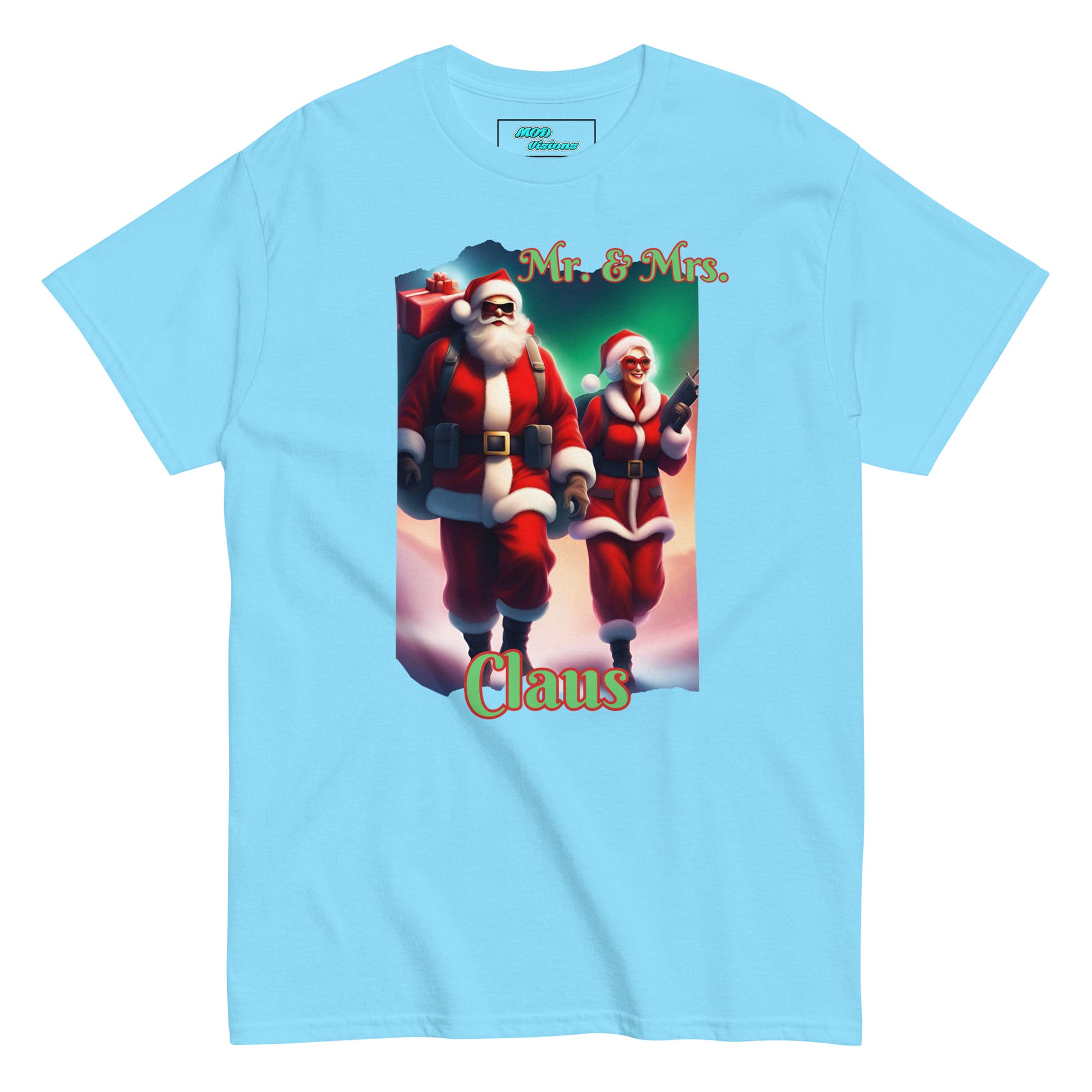 Picture this: Mr. Claus, donned in his signature red suit and hat, is ready to take on the world with his sack full of presents. But what makes this T-shirt truly stand out is the spirited Mrs. Claus by his side, armed and ready to protect her man. With a weapon in hand, she adds a dash of excitement to the classic holiday scene, showcasing a new dimension to the power couple.